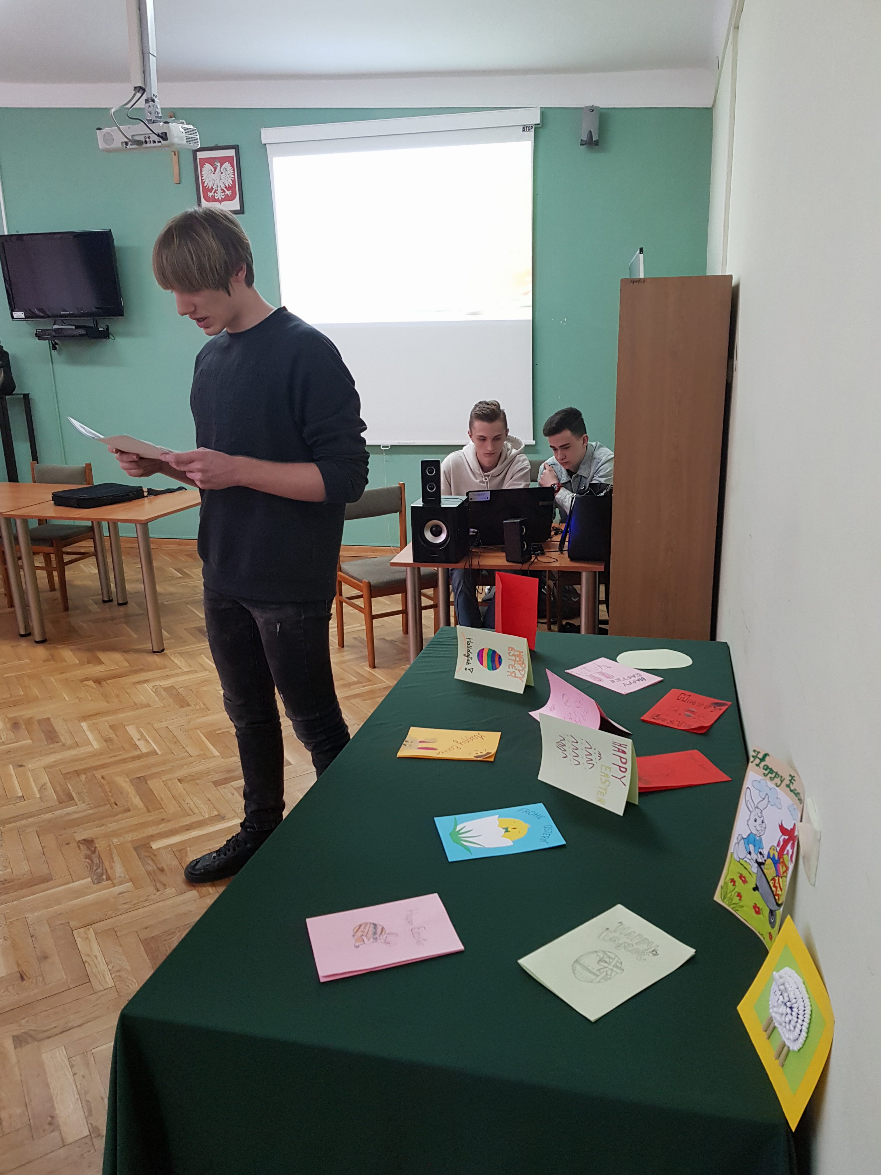 Dnia 27 marca 2018r. nauczyciele języków obcych: angielskiego, niemieckiego, rosyjskiego zorganizowali w szkole spotkanie poświęcone obchodom Świąt Wielkanocnych. Podczas akademii uczniowie obejrzeli prezentacje multimedialne, które pozwoliły zapoznać się z historią, tradycjami i obrzędami tych świąt w krajach anglojęzycznych, niemieckojęzycznych i rosyjskojęzycznych. Słuchano piosenek towarzyszących obchodom tych dni. Uczniowie mieli okazję poszerzyć słownictwo tematyczne oraz wymowę nowych zwrotów charakterystycznych dla danego obszaru językowego. Zapoznali się również z różnicami w obchodzeniu Wielkanocy w różnych krajach. Oceniono kartki z życzeniami świątecznymi przygotowane przez uczniów naszej szkoły. Na koniec spotkania uczniowie korzystając z aplikacji Kahoot rozwiązali quiz tematyczny.